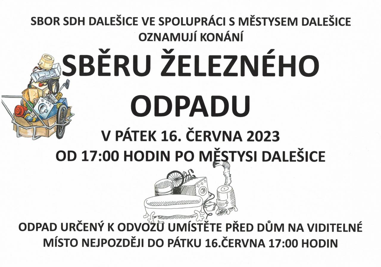 - SDH Dalešice ve spolupráci s městysem Dalešice v pátek 16.června od 17:00 hodin uskuteční sběr železného odpadu po Dalešicích. Železný odpad určený k vývozu připravte před Váš dům na viditelné místo, nejpozději do pátku 16.6. – 17:00 hodin.