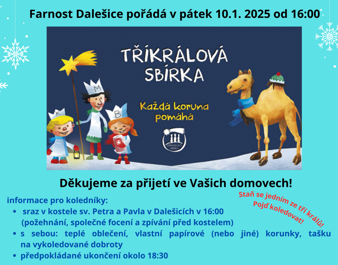 - V pátek 10.ledna od 16:00 hodin proběhne v Dalešicích Tříkrálová sbírka. Bude zahájíme společným zpíváním a troubením v 16:15 před kostelem sv. Petra a Pavla. Tříkrálová sbírka je největší dobročinnou sbírkovou akcí v České republice. Letos se koná již 25. ročník této sbírky. Vykoledované peníze pomohou statisícům lidí v nouzi prostřednictvím Charity Česká republika. Koledníka Tříkrálové sbírky poznáte podle kasičky označené logem Charity Česká republika. Kasička je zapečetěna. Děkujeme za přijetí ve Vašich domovech.